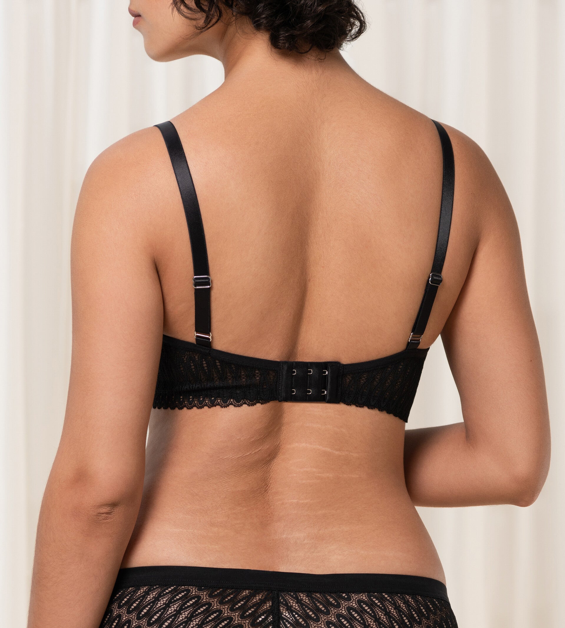 - Afwerking van kant met schulpranden op de bh-band en vleugels
