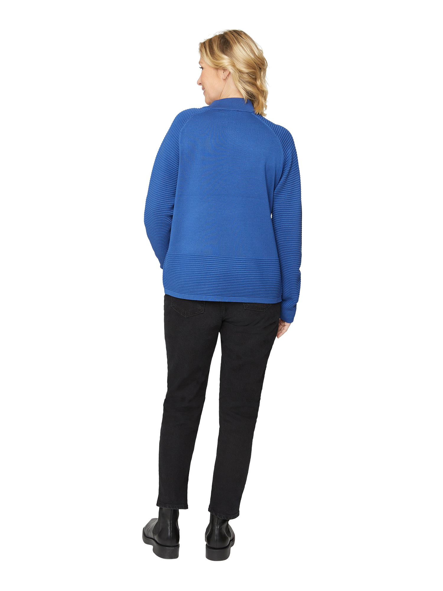 Gebreide trui gemaakt van viscose en polyamide, van Brandtex. Dit breiwerk is in raglanvorm genaaid. Het heeft lange, smalle mouwen. De mouwen en het onderste deel van de voor- en achterkant zijn gebreid in een zware, gegroefde structuur. Het heeft een hoge col en een sluiting met ritssluiting. Het is lekker warm en comfortabel om te dragen.