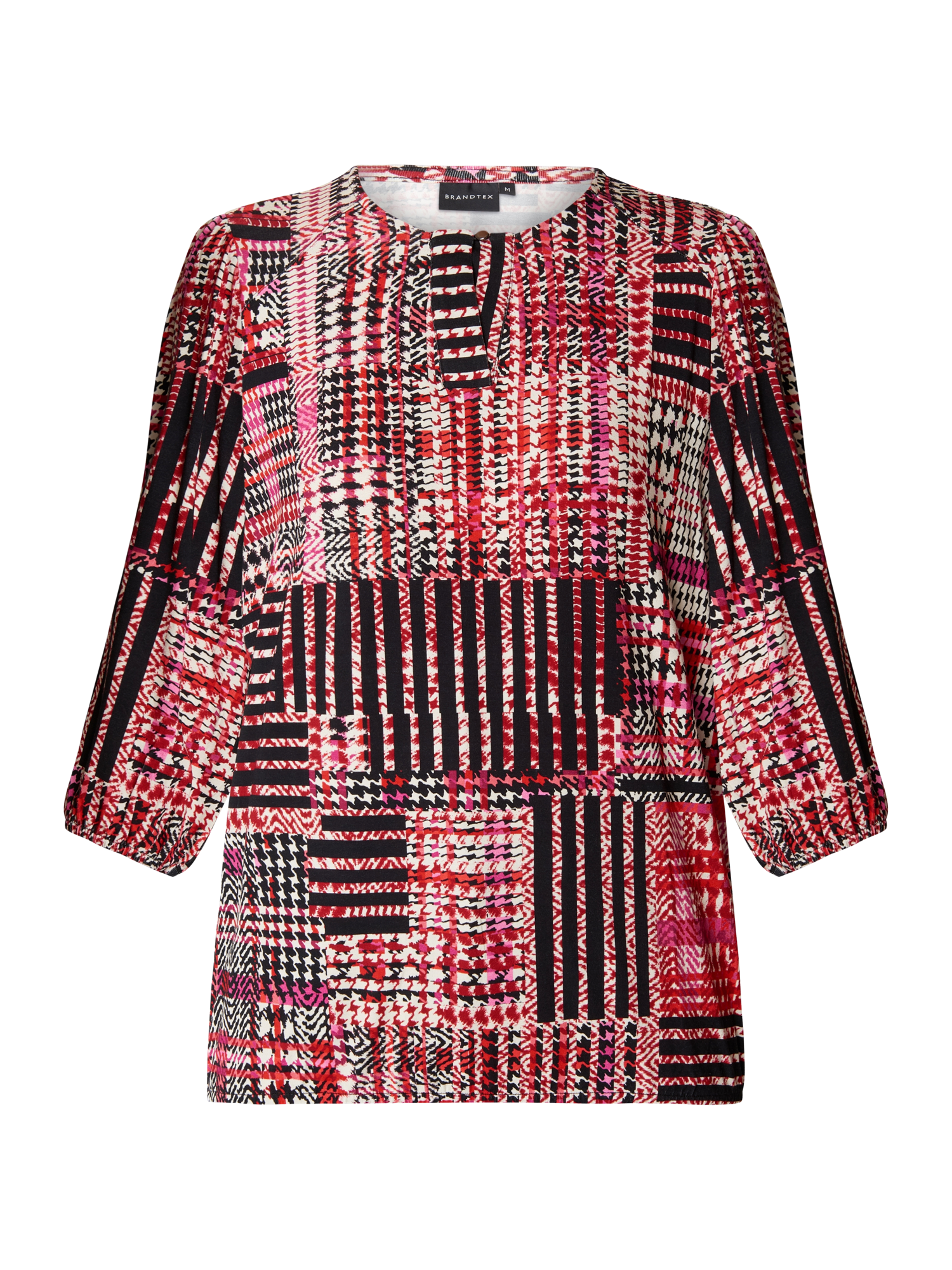 Kleurrijk T-shirt gemaakt van viscose en elasthaan. Van Brandtex. Dit T-shirt heeft 3/4-mouwen en een rechte snit aan de zoom. Het heeft een ronde halslijn met een kleine, open V-snede met knoopsluiting. Een fijn T-shirt voor broeken en rokken.