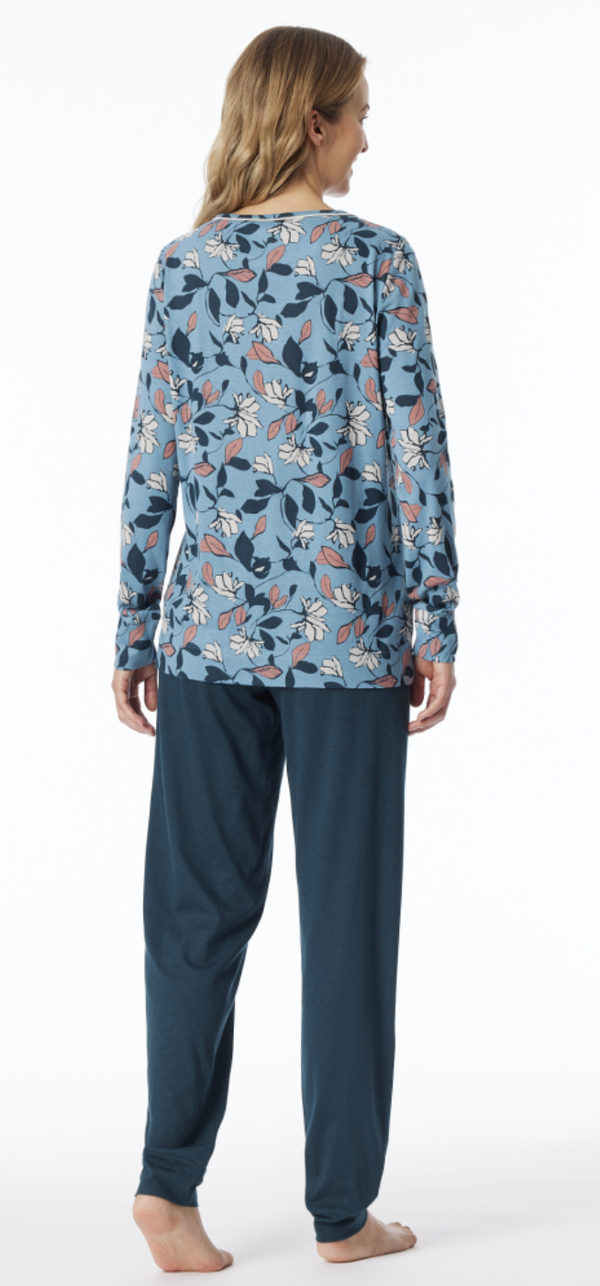 lange damespyjama met bedrukt shirt met bloemen in blauw, rood en rood en nachtblauwe broek