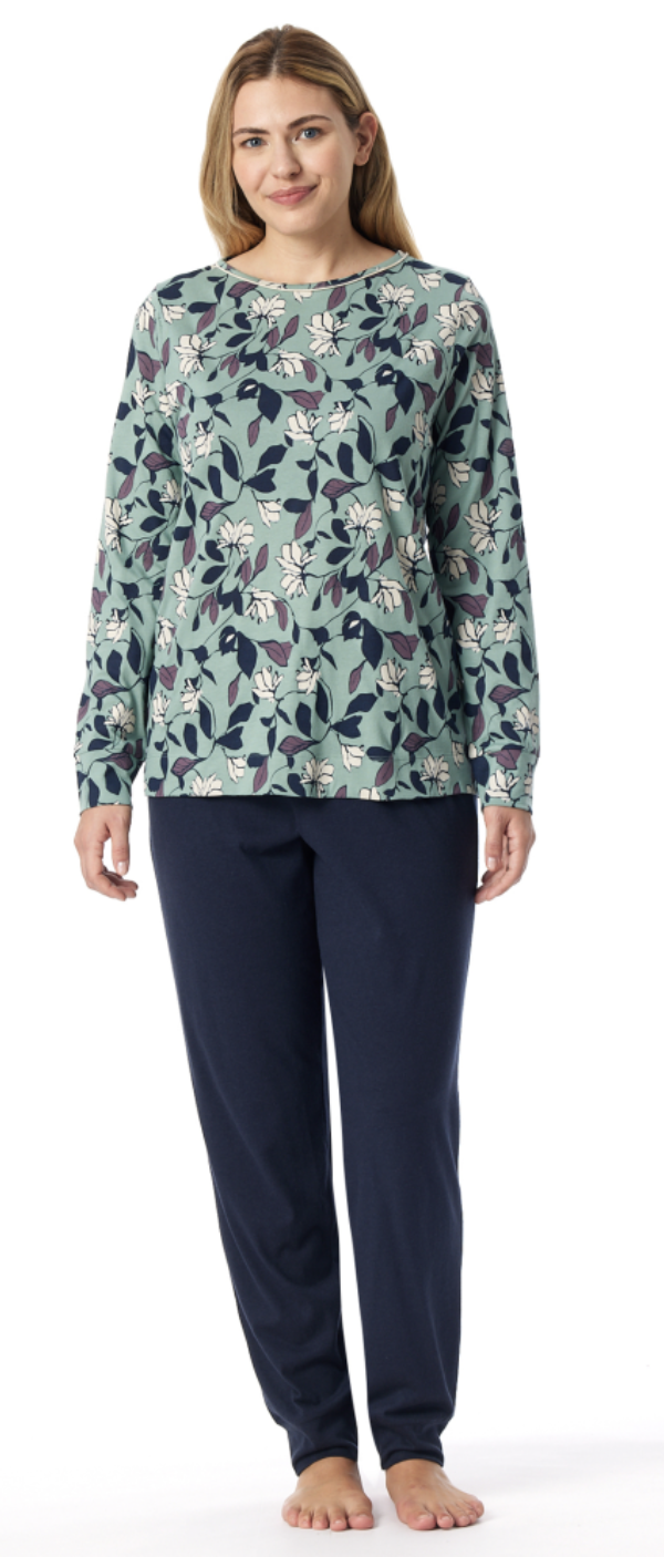 - lange damespyjama met shirt met bloemenbedrukking in nachtblauw en mauve en nachtblauwe broek