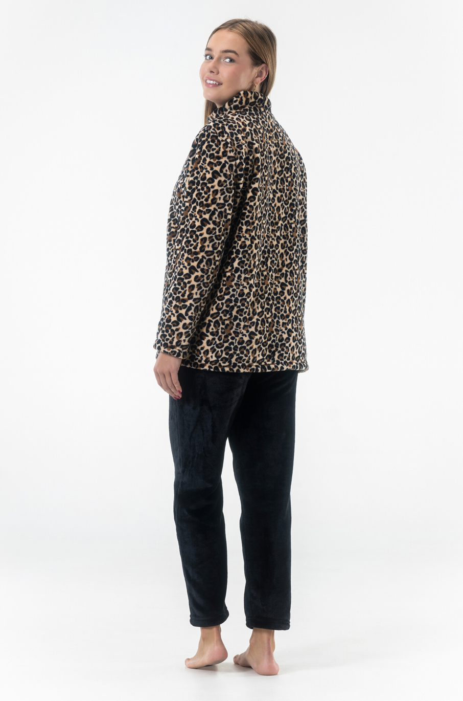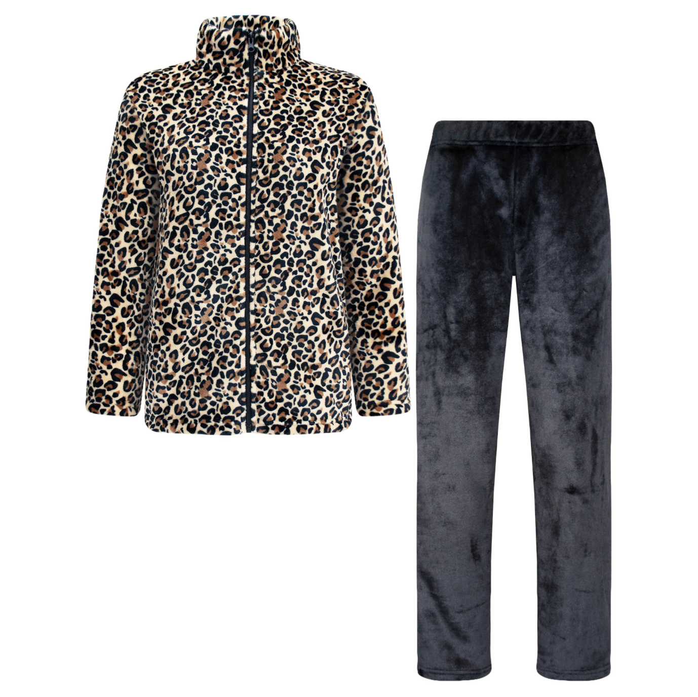 Ontspan in stijl met dit heerlijk zachte fleece huispak. De set bestaat uit een modieus jasje met luipaardprint en ritssluiting, voorzien van een hoge kraag voor extra warmte en handige zijzakken. De bijpassende zwarte fleece broek is effen en uitgevoerd met een elastische tailleband, waardoor comfort en een perfecte pasvorm gegarandeerd zijn.