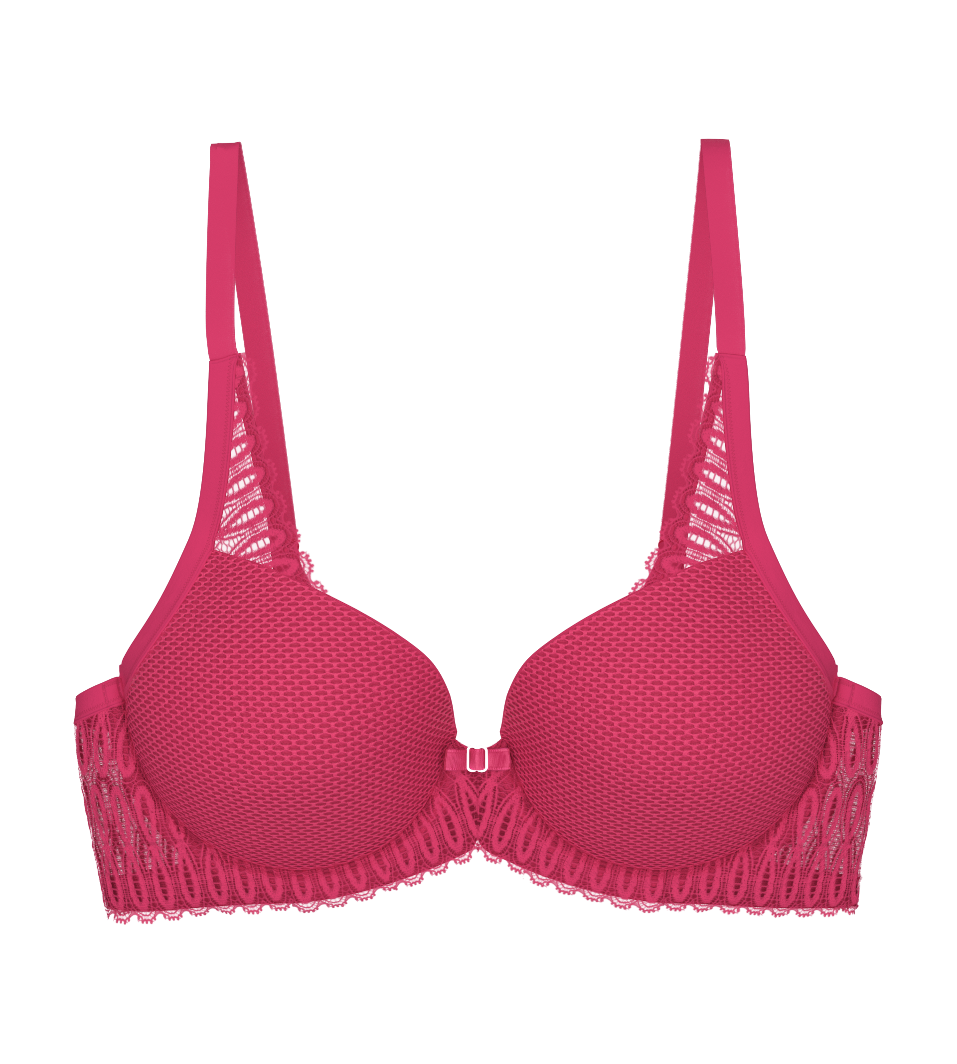 - Afwerking van kant met schulpranden op de bh-band en vleugels