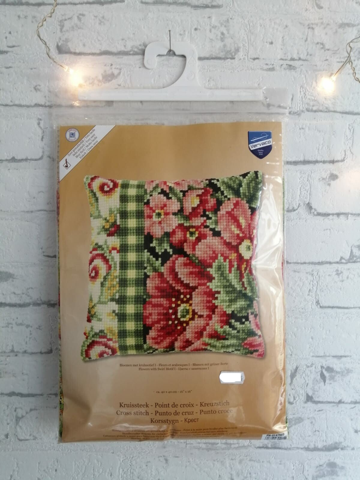 Bloemen met krulmotief I - Vervaco borduurkussen