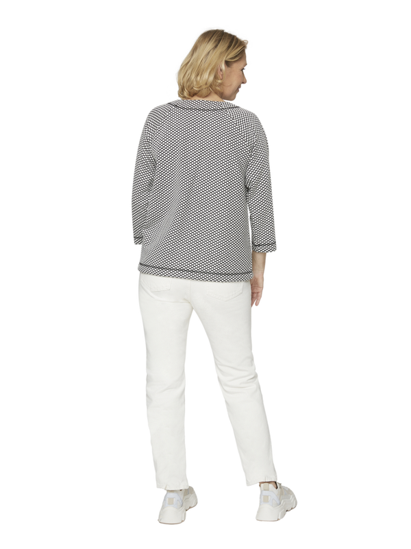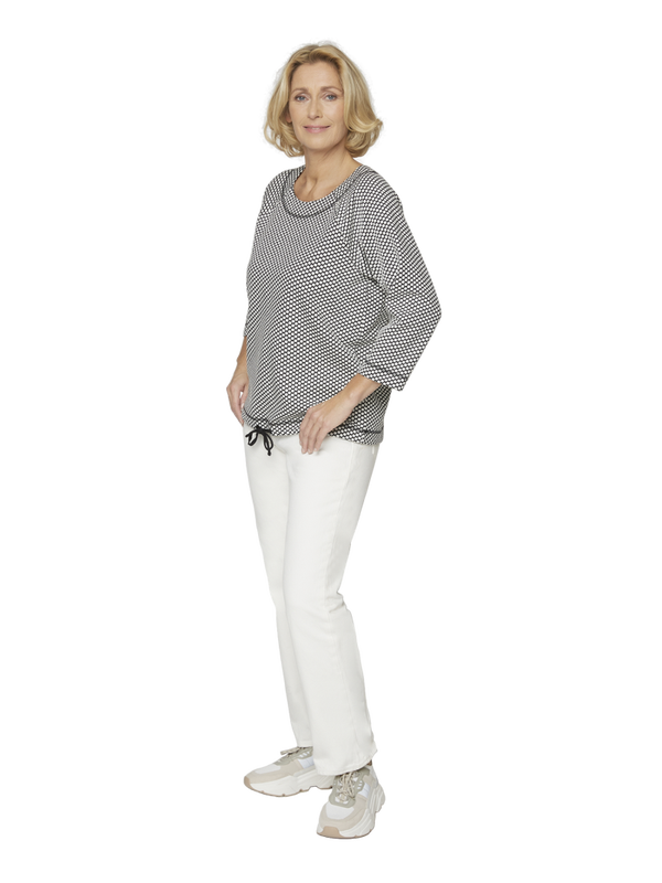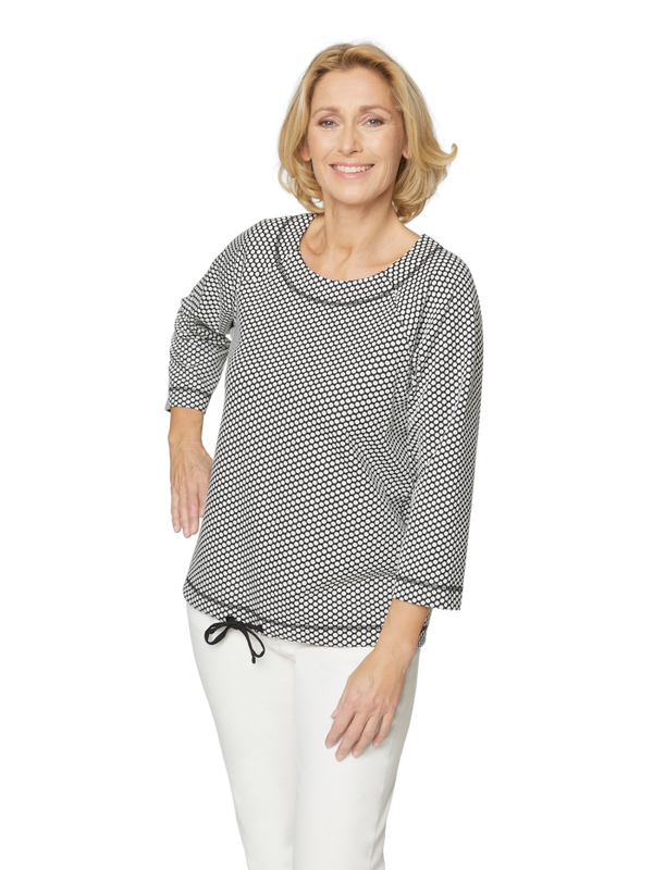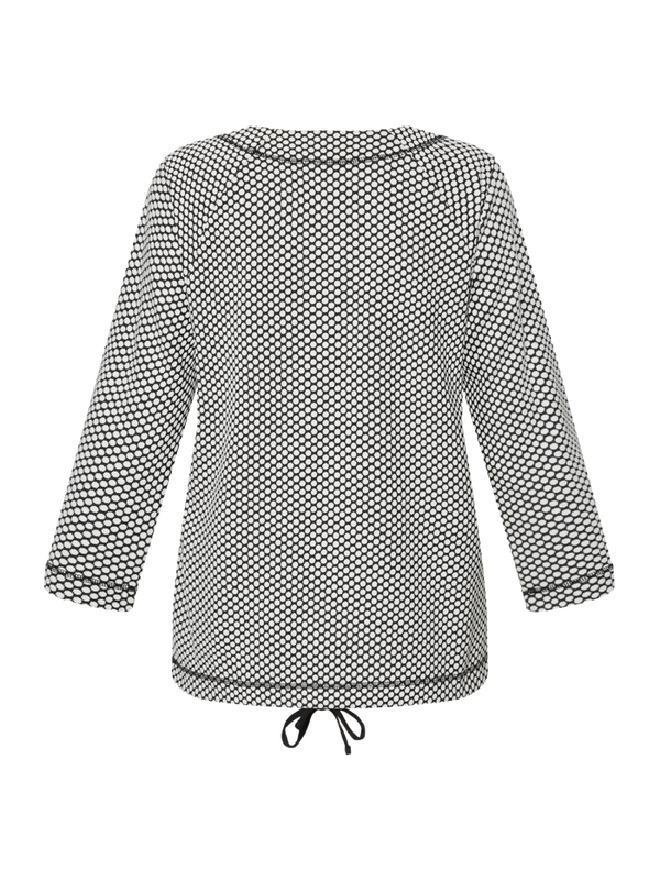 Mooie blouse van Brandtex met wijde halslijn en 3/4 mouwen en touwtjes aan de zoom. De blouse is van een rekbare jersey kwaliteit waardoor hij erg comfortabel draagt. Mooie afdruk.